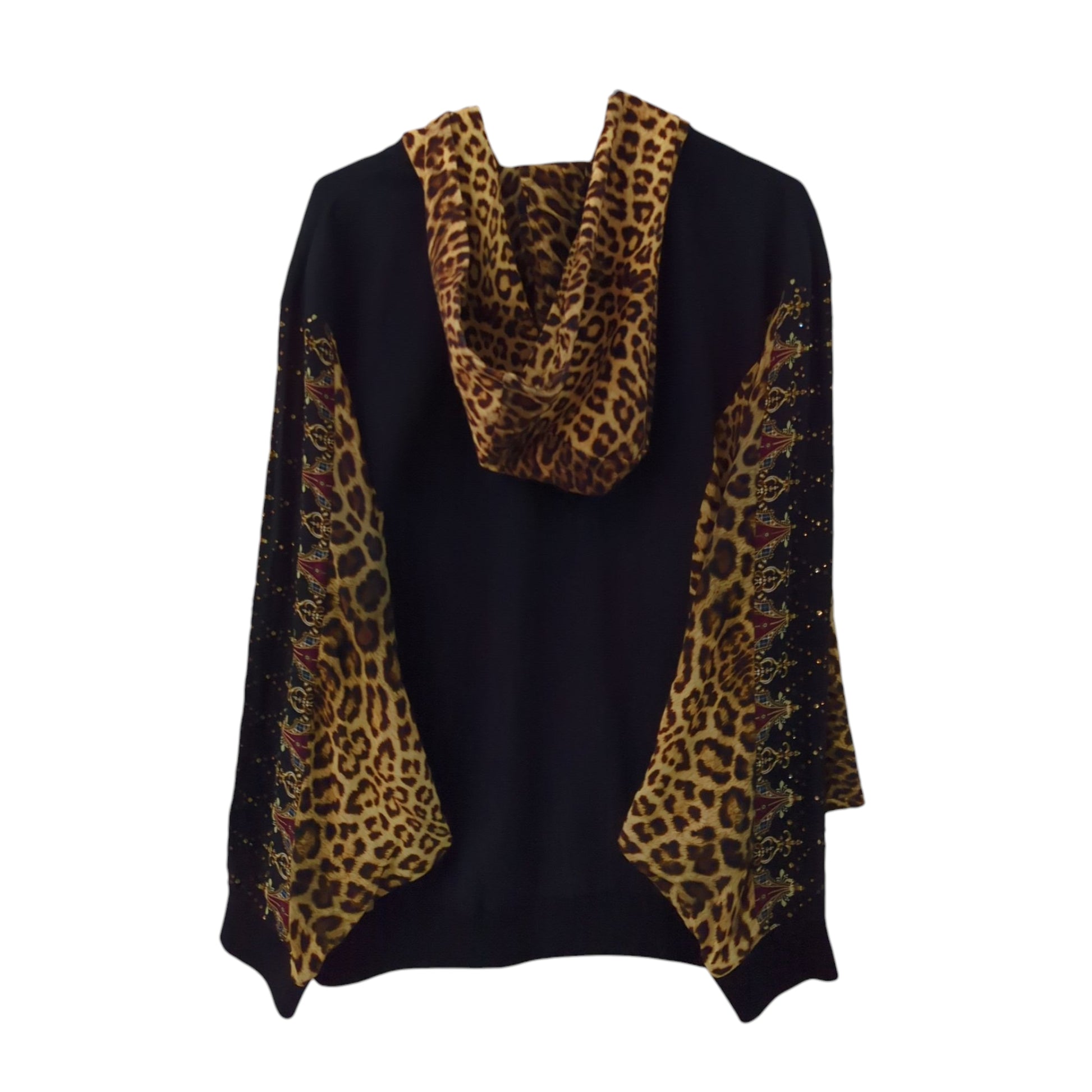 Make a bold statement with this eye-catching leopard Print hoodie. Featuring striking leopard panels contrasted with solid black sections. Perfect for layering, it's a versatile piece that takes you from casual outings to standout looks.