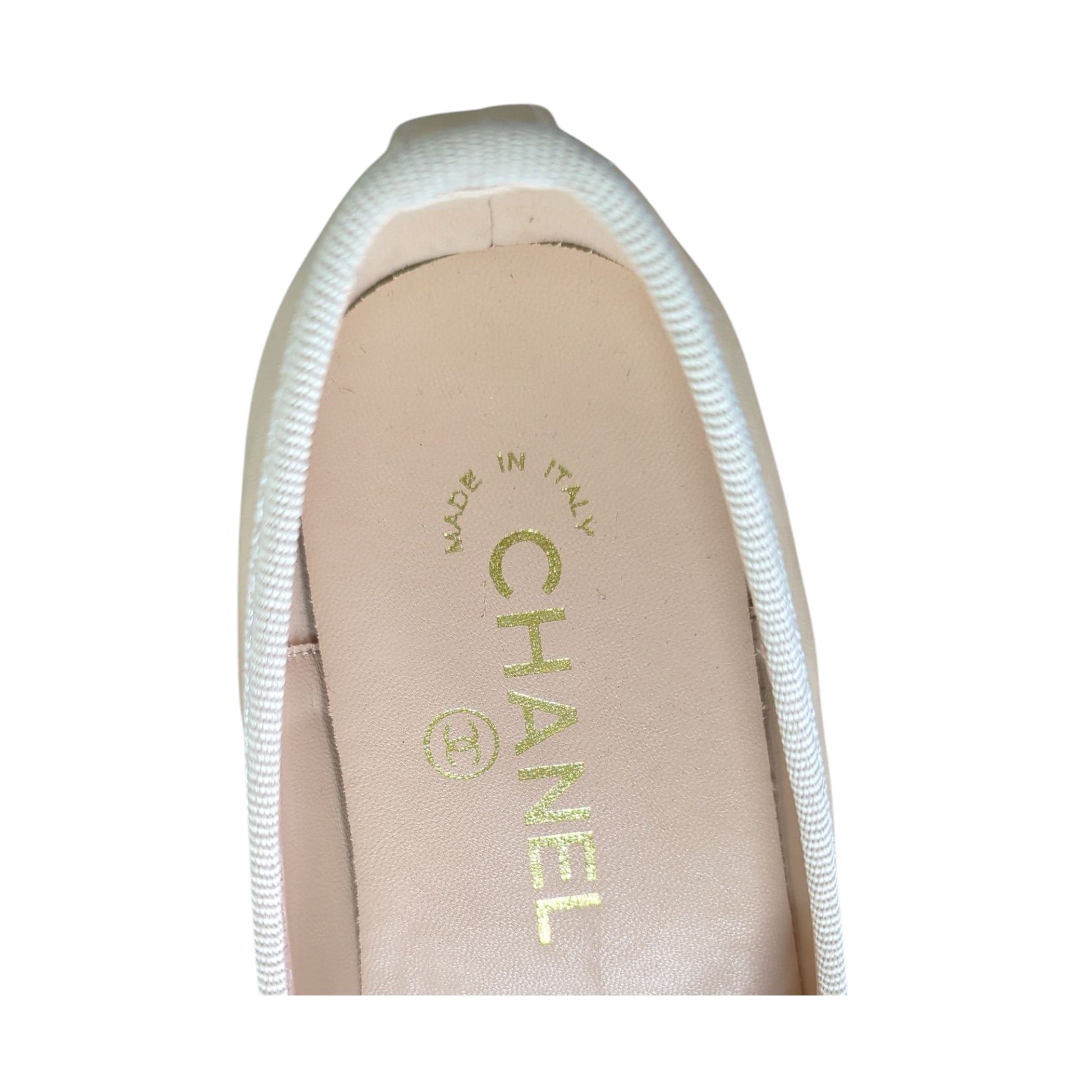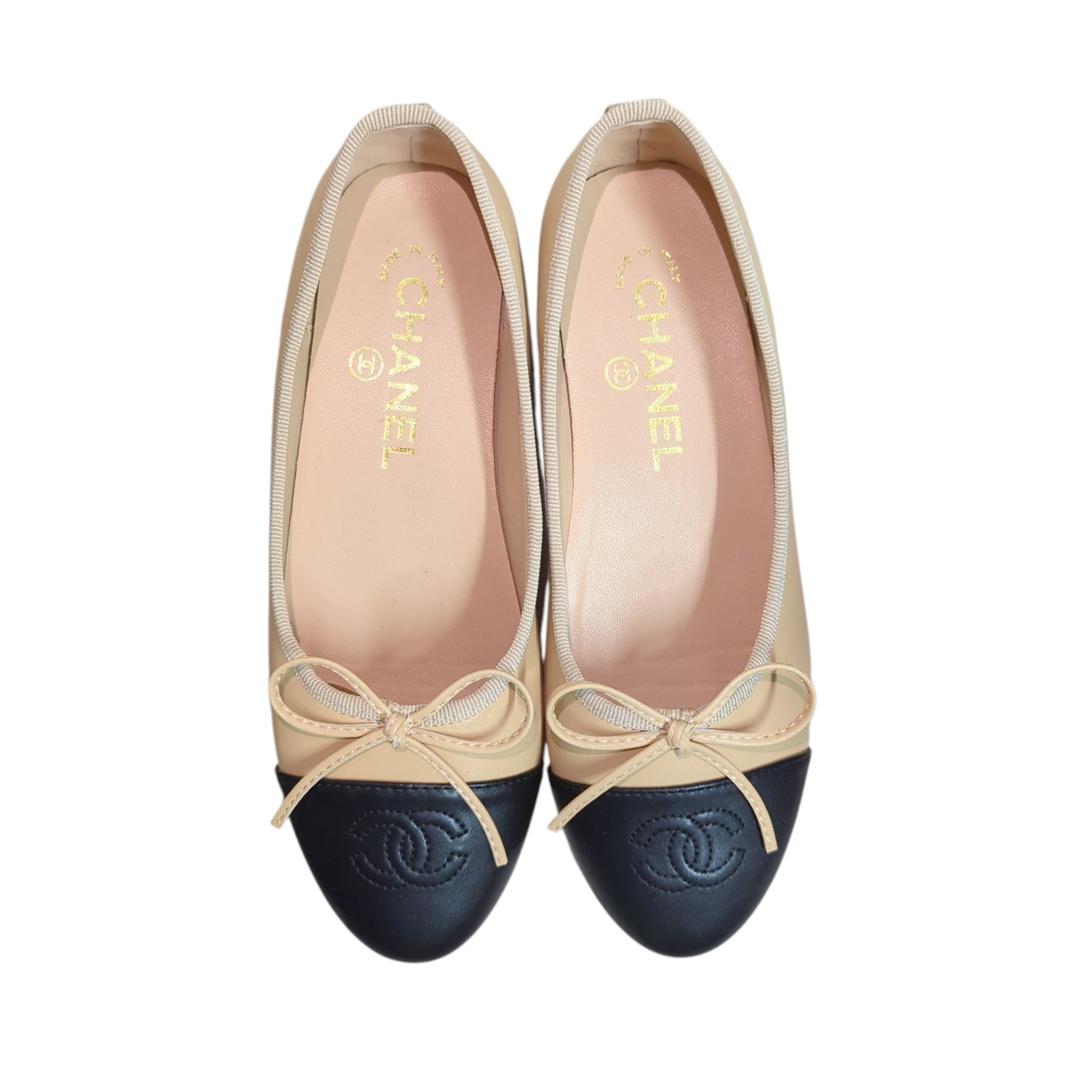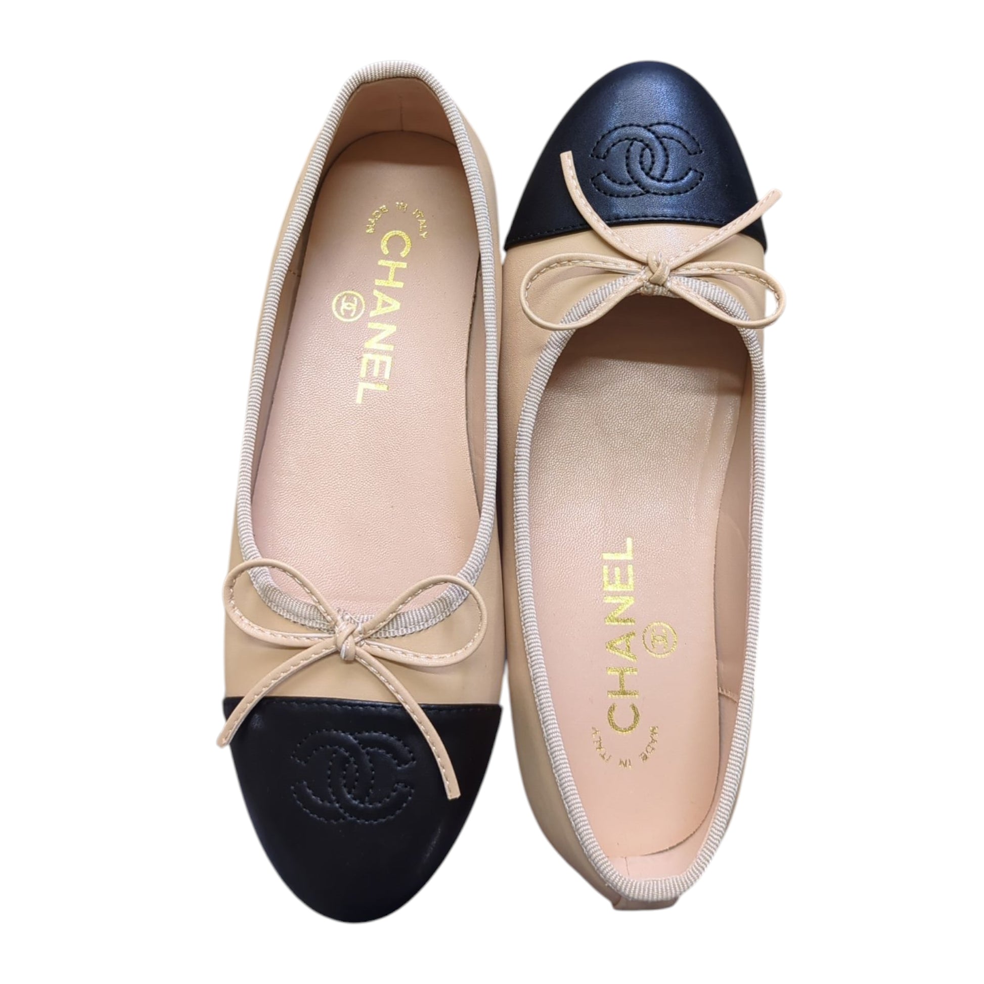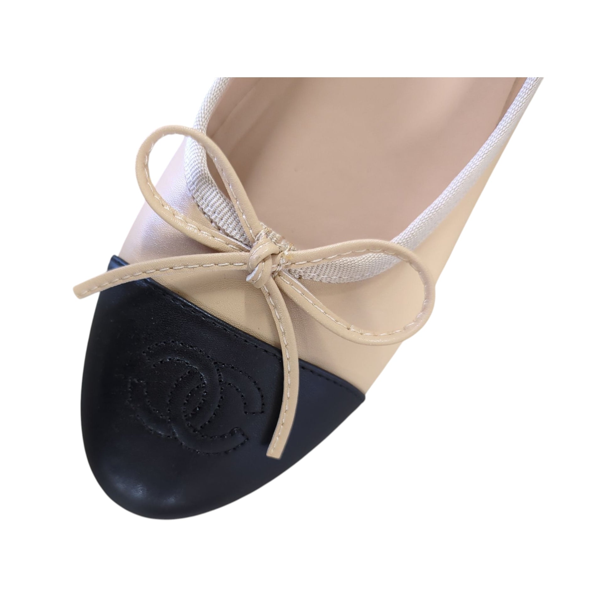 An iconic Chanel classic, these two-tone ballet flats embody timeless Parisian elegance. Crafted in beige leather with the signature black cap toe, each pair is finished with a delicate bow and embossed CC logo.